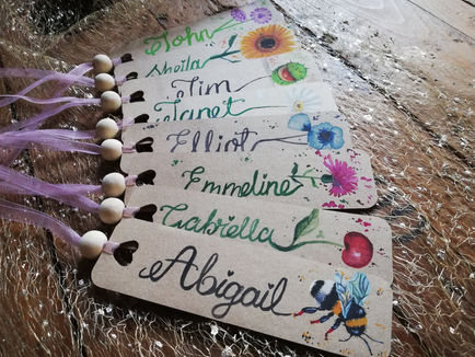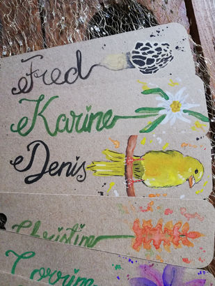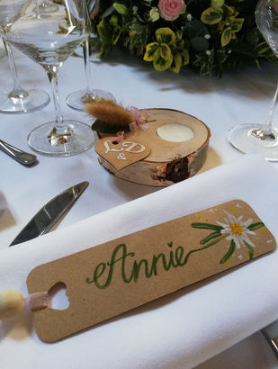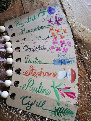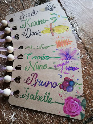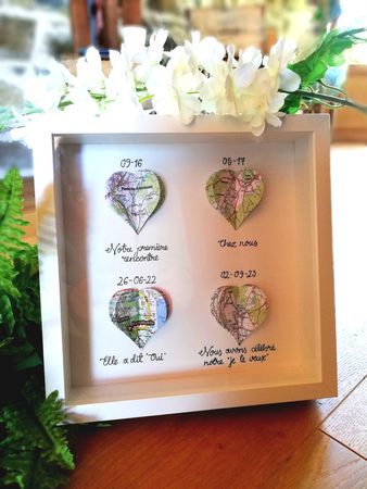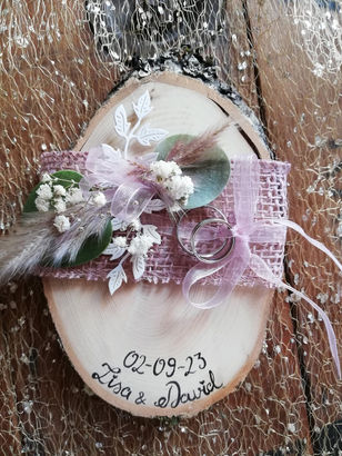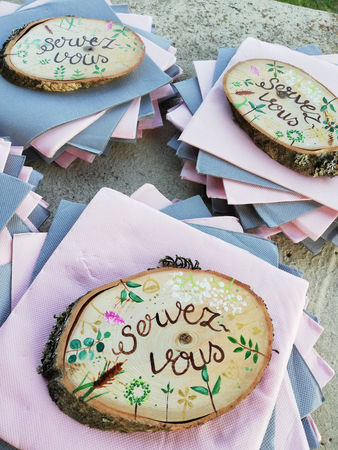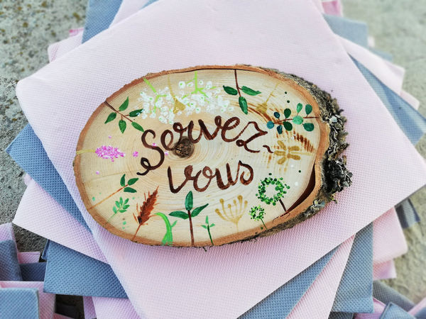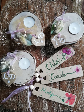 Je travaille sur une variété de supports, tels que des rondelles de bois, des toiles, des cottages décorés avec des morceaux de bois, ainsi que des éléments de déco de mariage. Ces supports ne sont pas des produits finis disponibles en atelier, mais des projets réalisés sur mesure, en fonction de vos idées et besoins.